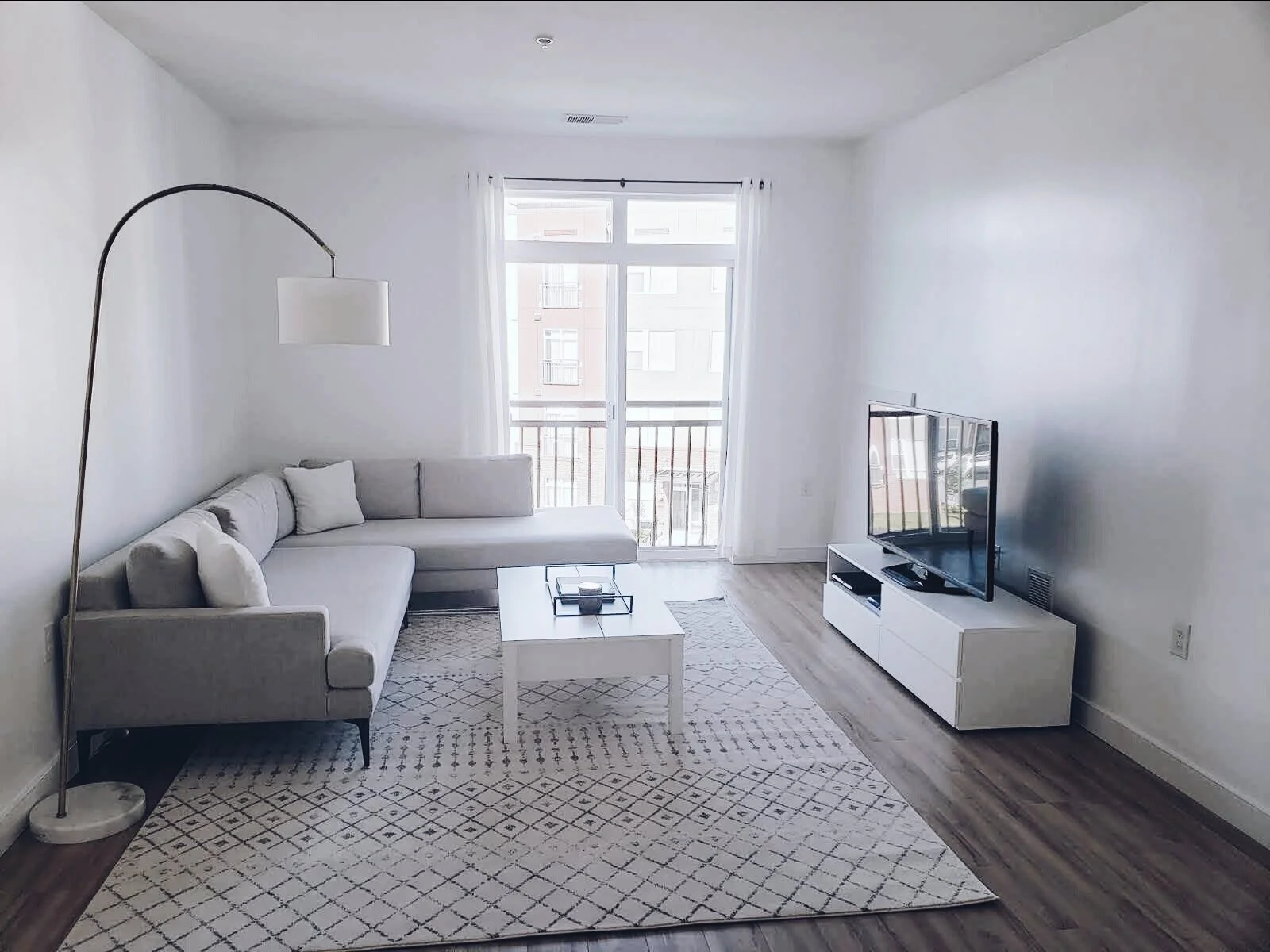 After - the space is a complete contrast from the original state. Bright white paint on the walls, modern, sleek furnishings, and a soft, neutral palette throughout.